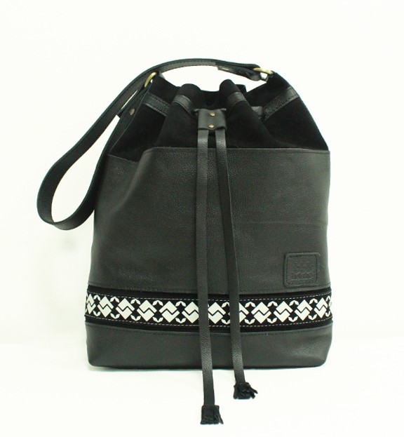 Simply designed and expertly crafted, Alaba drawstring bucket bag is made of rich black leather finished with a unique Ethiopian inspired print.