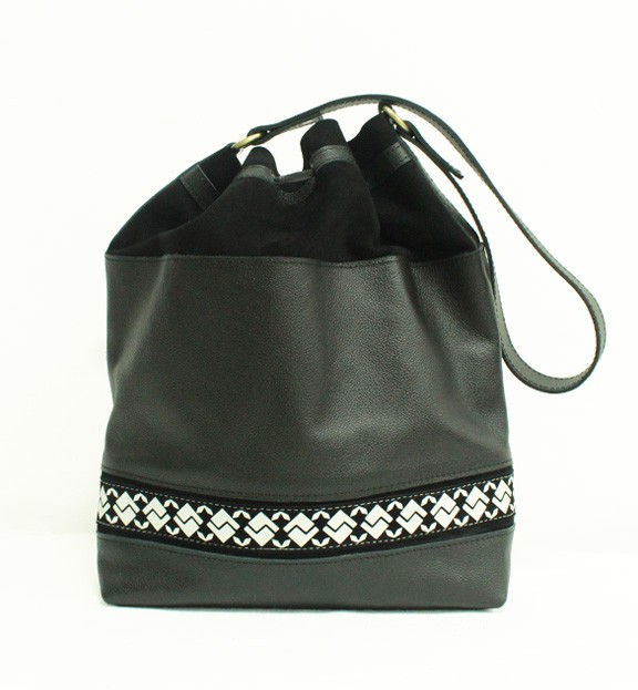 Simply designed and expertly crafted, Alaba drawstring bucket bag is made of rich black leather finished with a unique Ethiopian inspired print.
